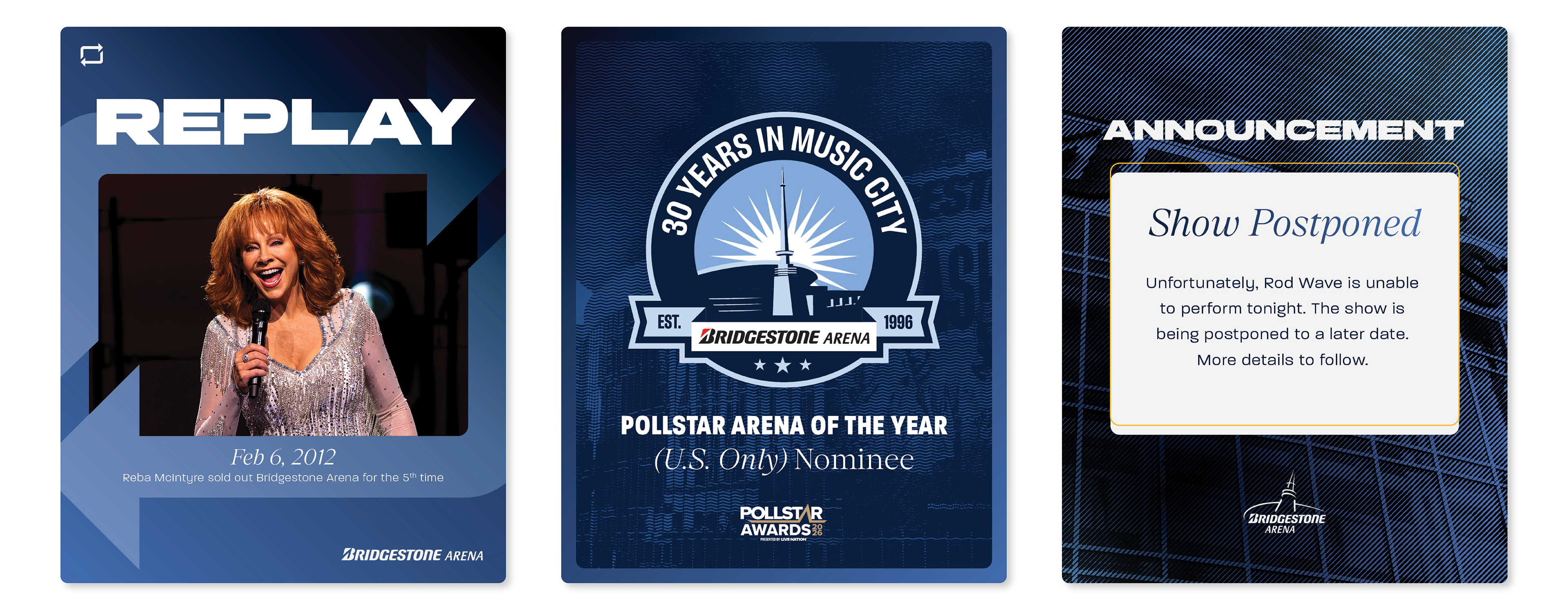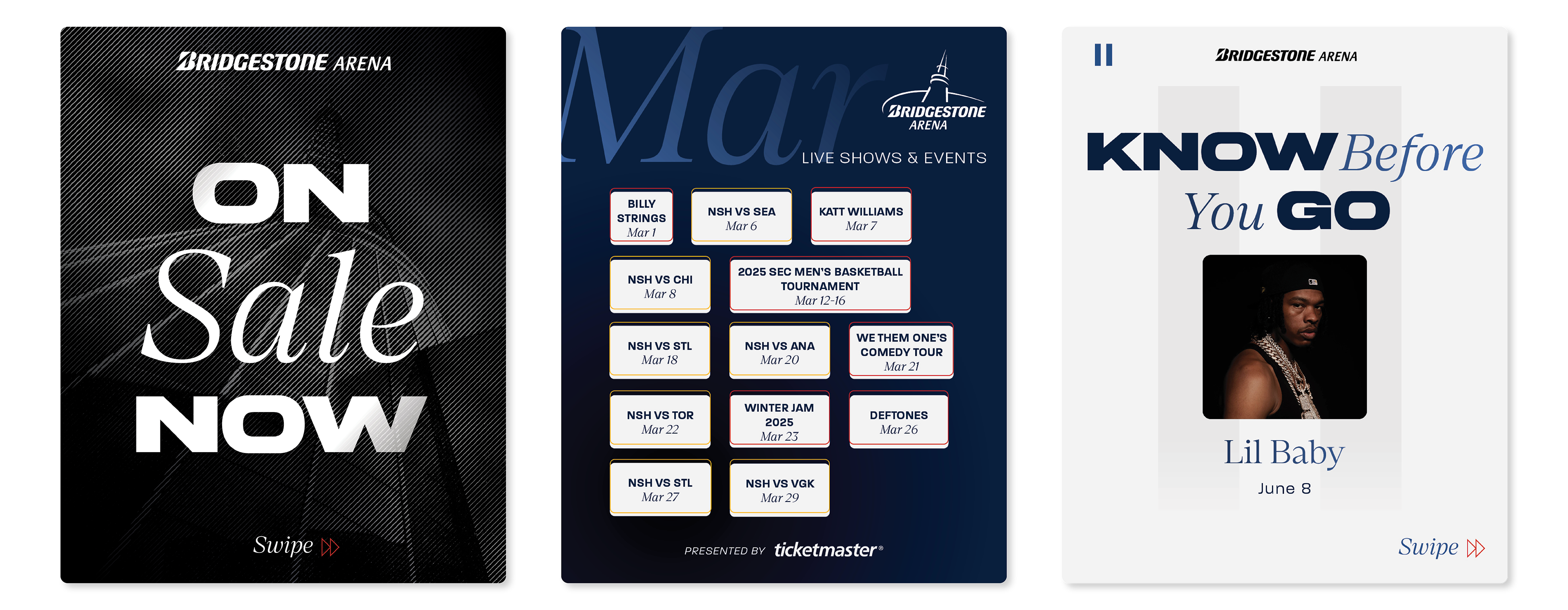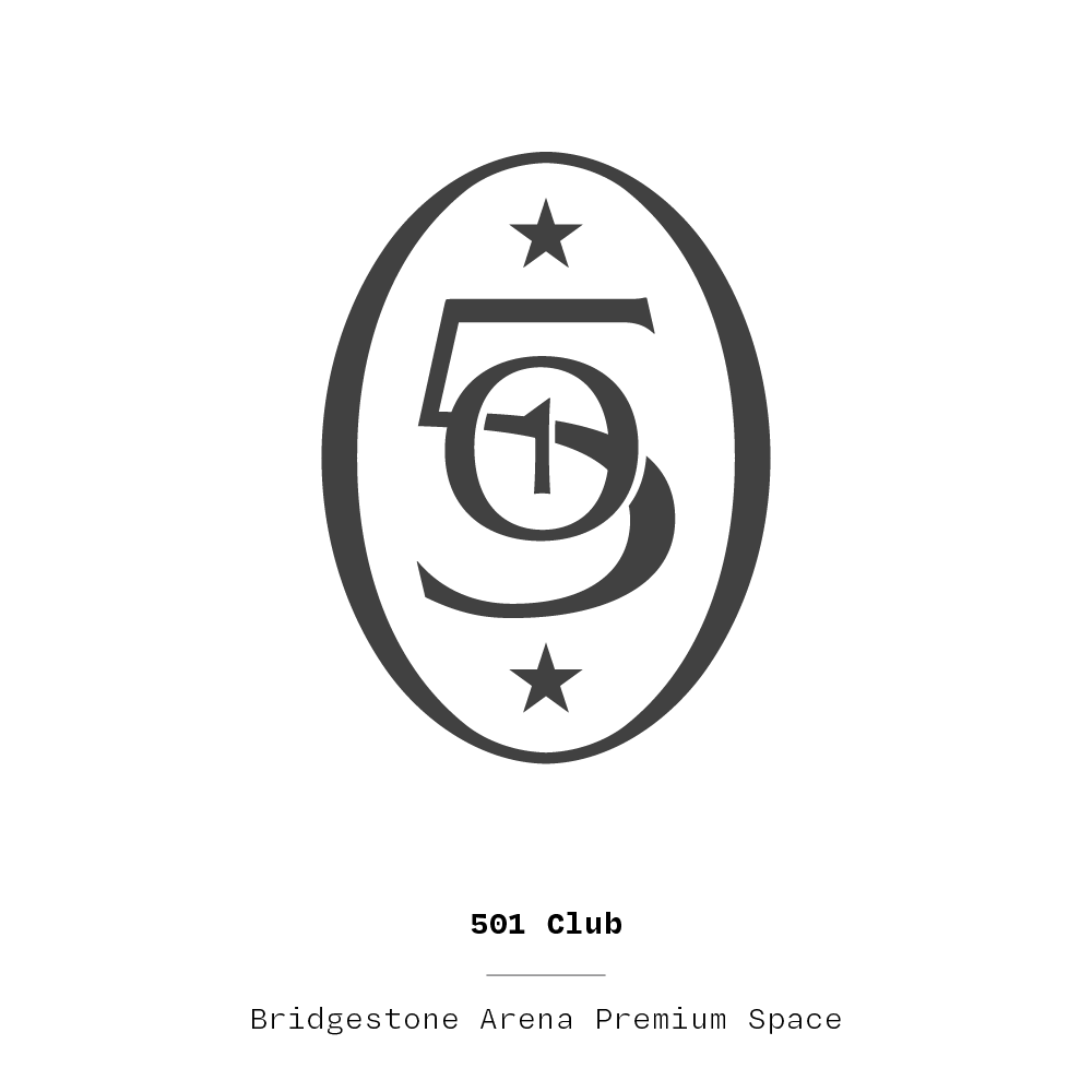 In a town full of iconic venues, our Arena marketing team approached us for a new proprietary graphics style that could help Bridgestone Arena stand out. We decided to lean into a more modern direction to fit the modern architecture of the arena, with blue being brought in to emulate the many glass towers that now surround the arena in Downtown Nashville along with gold and red stroke accents to call out the neon lights that line Broadway.