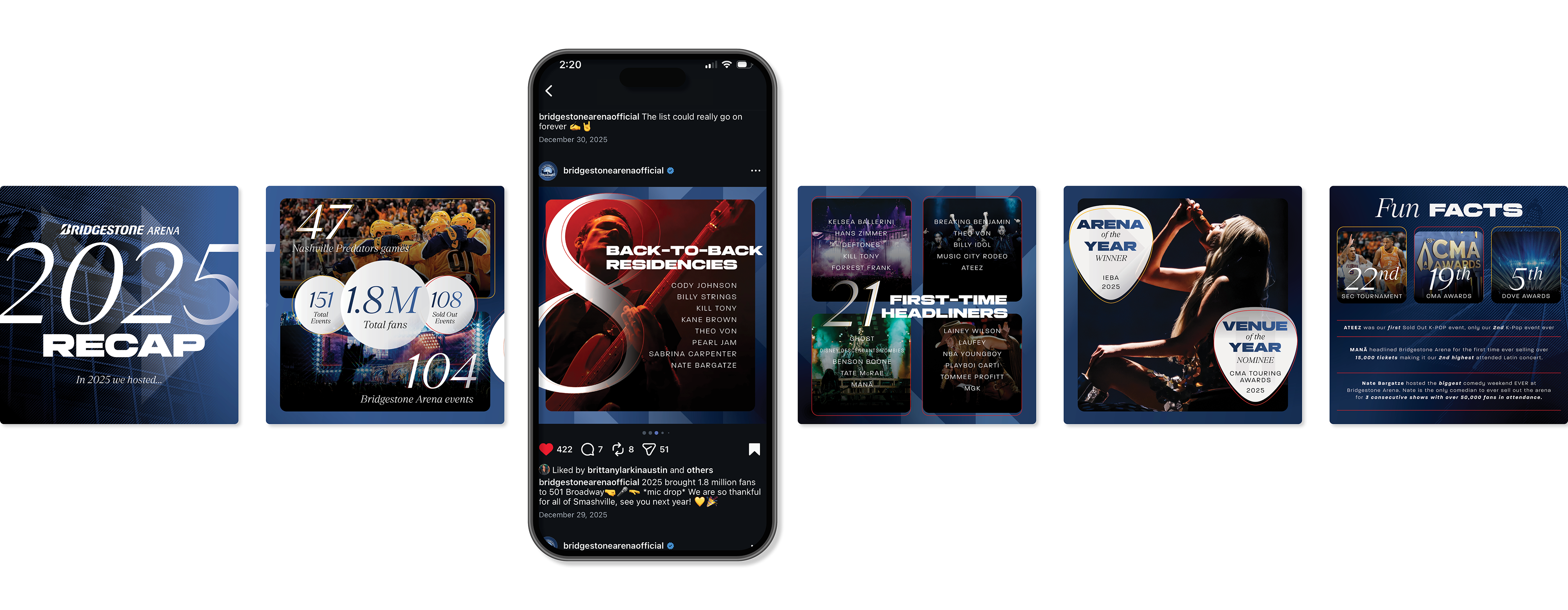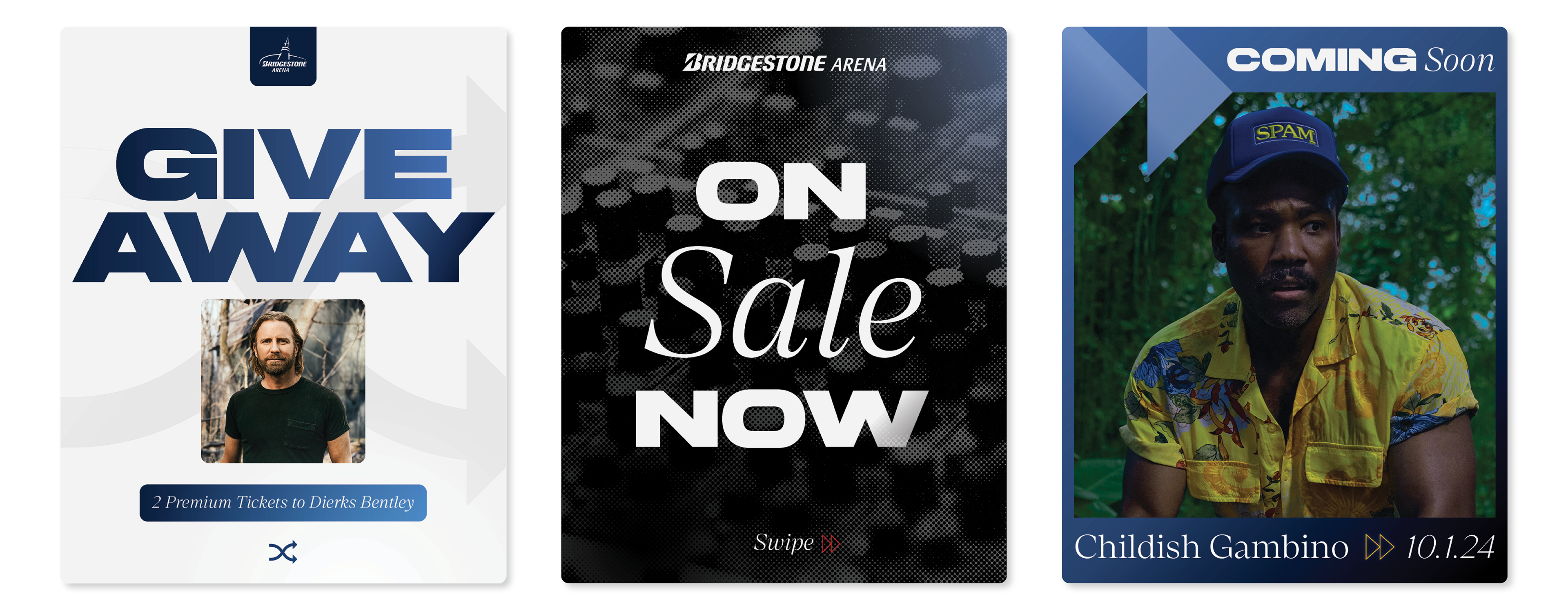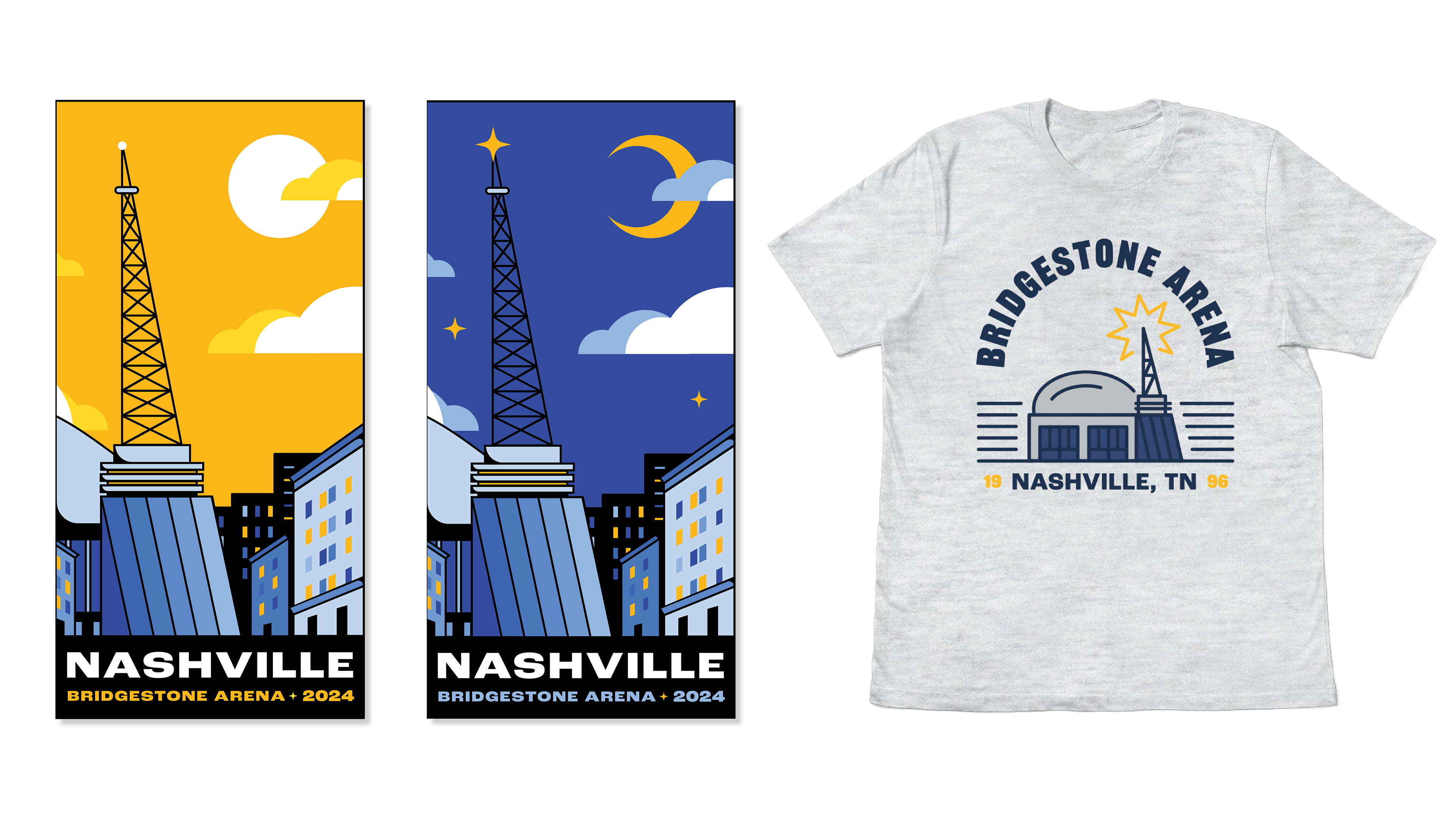 In a town full of iconic venues, our Arena marketing team approached us for a new proprietary graphics style that could help Bridgestone Arena stand out. We decided to lean into a more modern direction to fit the modern architecture of the arena, with blue being brought in to emulate the many glass towers that now surround the arena in Downtown Nashville along with gold and red stroke accents to call out the neon lights that line Broadway.